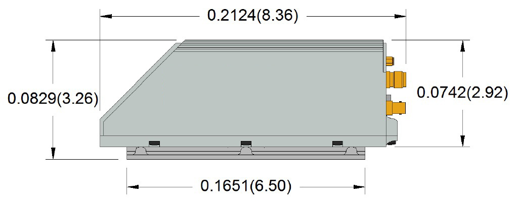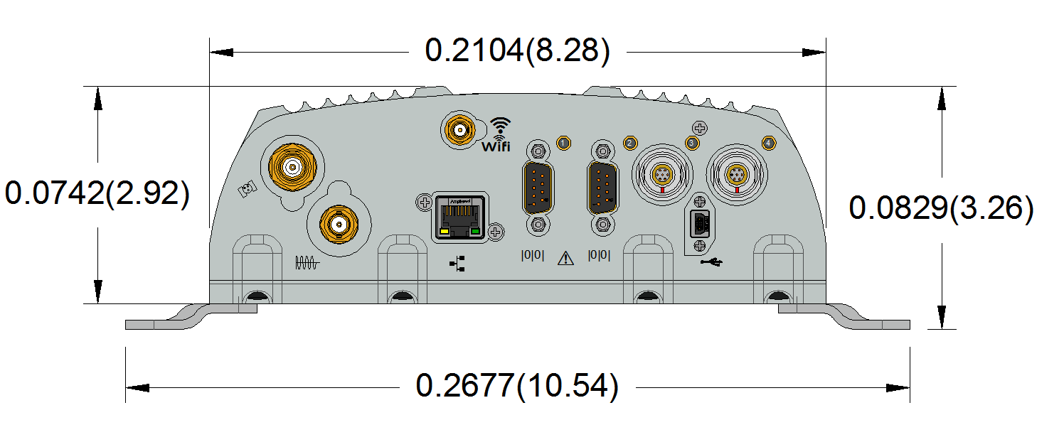 这几个图示出了阿洛伊GNSS接收机的尺寸。如果您需要为接收机制做安装支架和外罩,可以参考这些图。