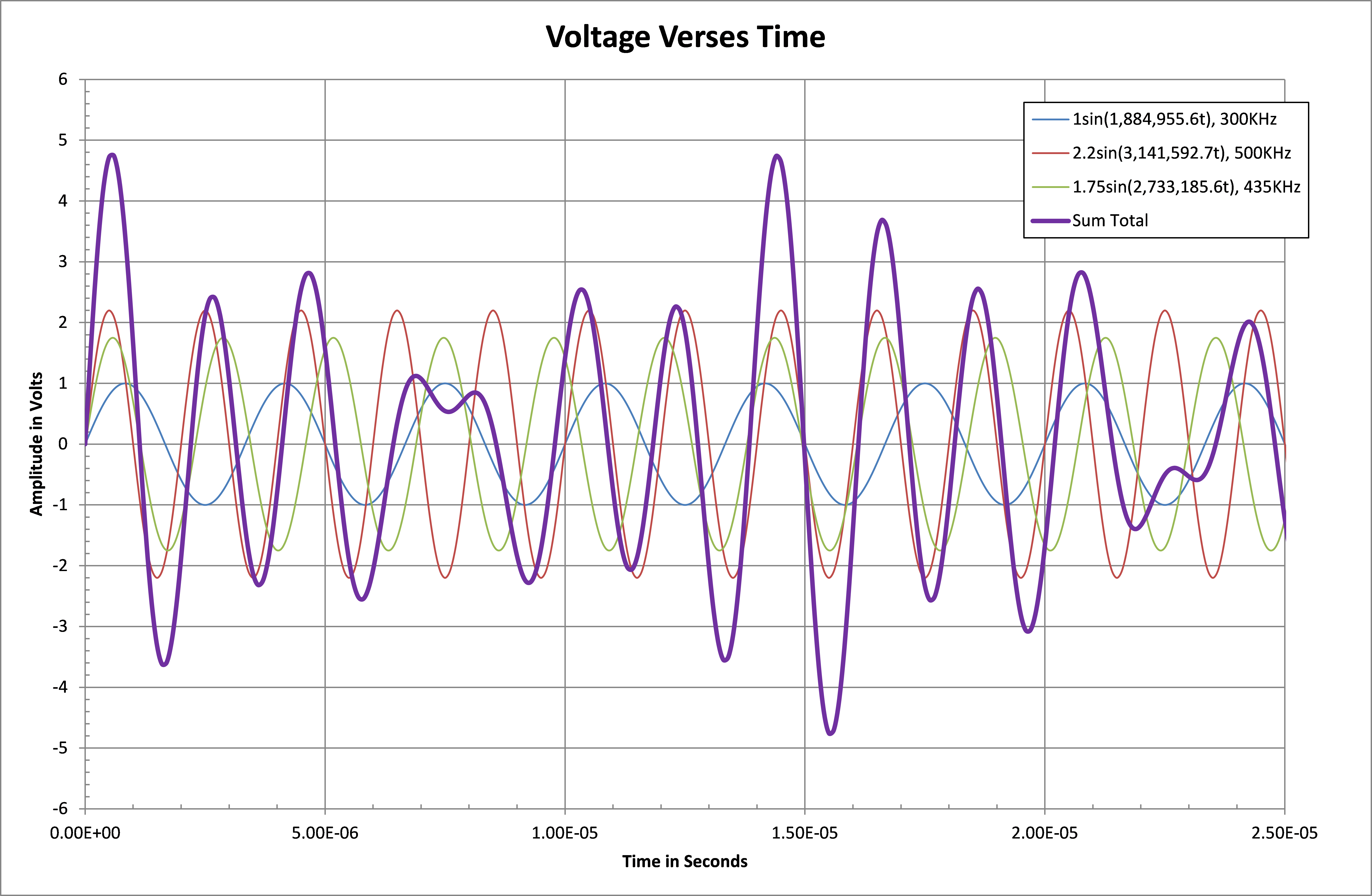 蓝色、绿色和红色曲线是上面给出的几种信号的例子,但是它们在真实示波器上并不可见,只有三个信号的叠加总和(即紫色粗曲线)将显示在示波器上。紫色粗曲线没有显示构成它的原始信号证据。观测者不会知道组成紫色曲线各分量信号的频率或振幅。