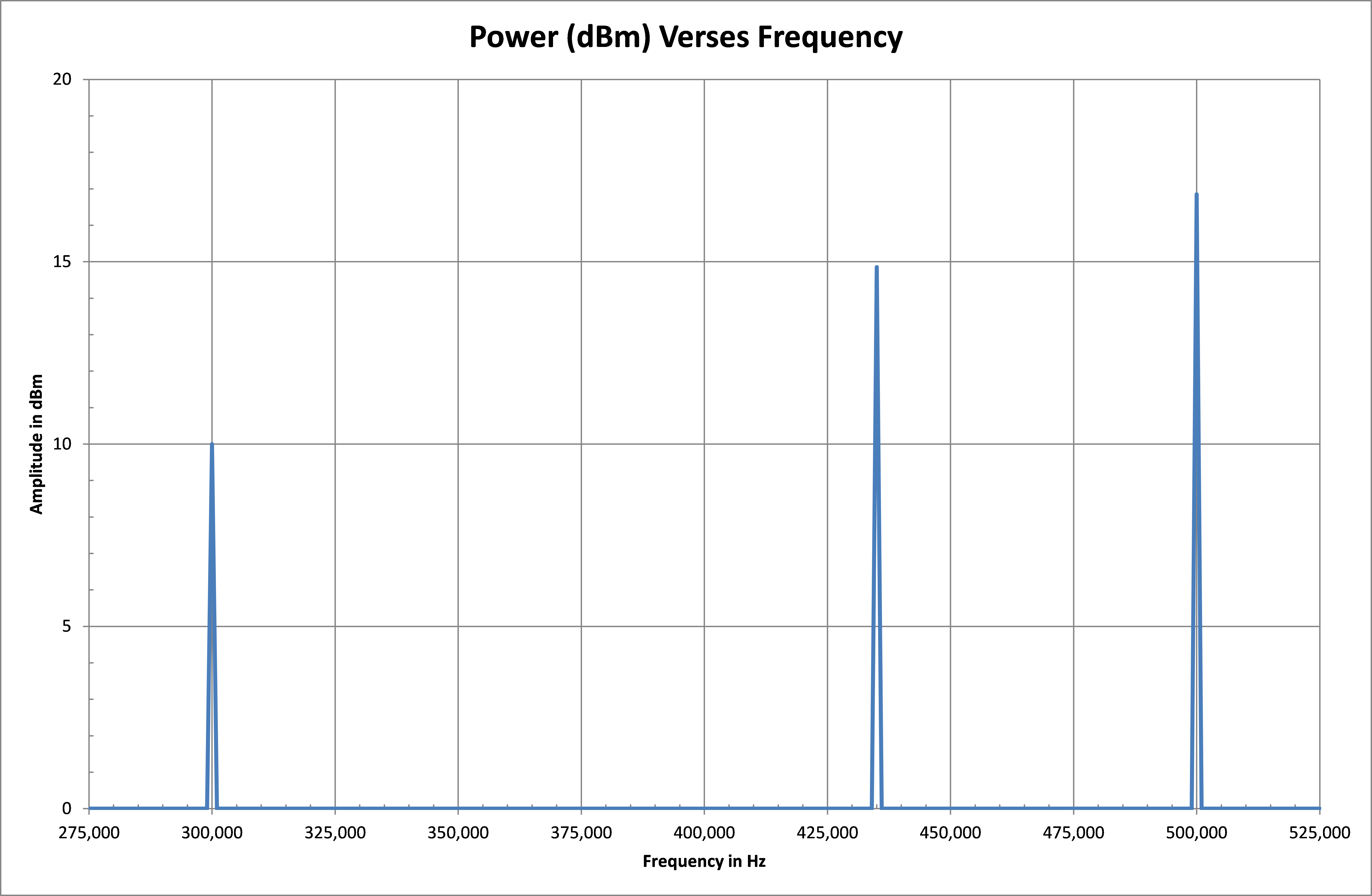 图1和图2所示幅度的明显差异可能会造成混淆。为了说明图2中的信号实际上是原始信号的例子,我们将关注第一个信号。信号一的峰值电压为1Vp。如果要计算功率,必须将其转换为均方根值,即:0.707*Vp 或 0.707Vrms。电压被驱动到50Ω负载中(实际上是频谱分析器的输入端)。为了计算该负载消耗的功率,必须对均方根电压进行平方,然后将该平方值除以电阻(50Ω),得出10mW。然后,必须将这个10mW转换为dBm值。为此,首先除以1mW(结果为10),取以10为底的对数(结果为1),再乘以10。这便产生10dBm的结果,恰好是图2在300Khz处显示的结果。